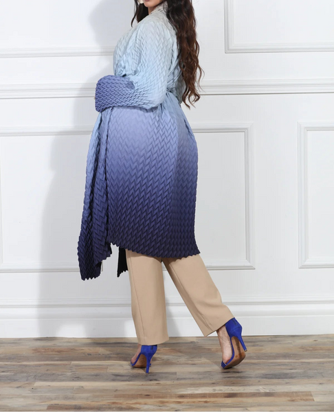 Ombre blue lightweight cardigan. Crinkled material, side pockets and tie at waist, longer in front, one size up to 2XL.
