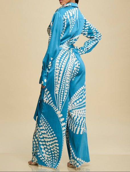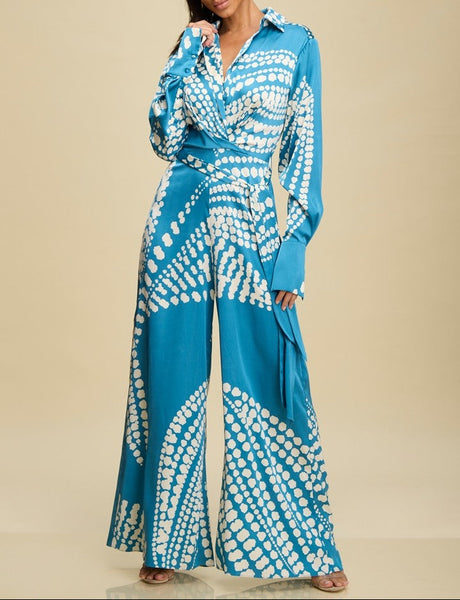 Sophisticated, teal color, dress shirt style wide legged jumpsuit with tie at waist. White polka dot print, extended cuff at wrist with buttons, collar. Not a stretch material.