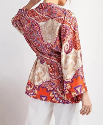 Elegant silky feel short kimono that can be worn as a jacket or top. Pink or Orange with paisley style print, tie at waist.