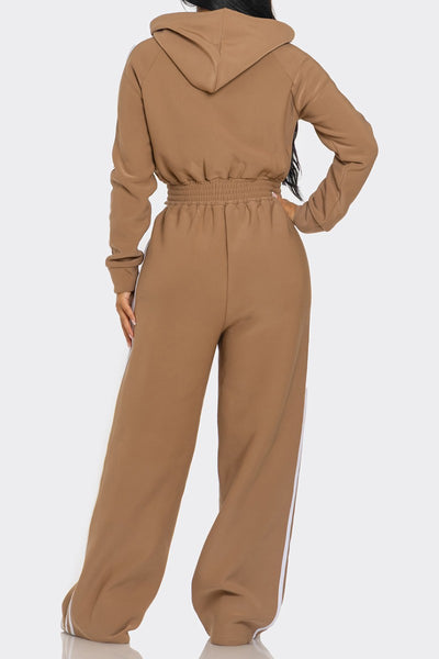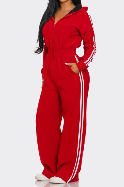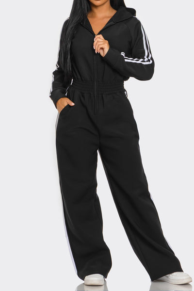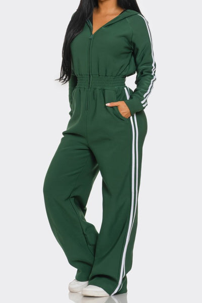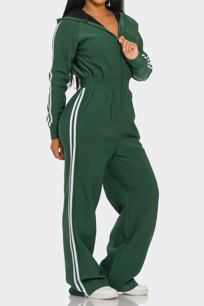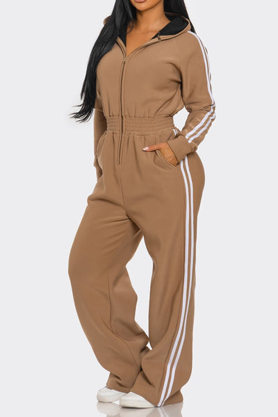 Casual and cute fleece lined, side striped hooded jumpsuit. Soft comfortable fabric, good stretch. Zipper front, elastic waistline.
