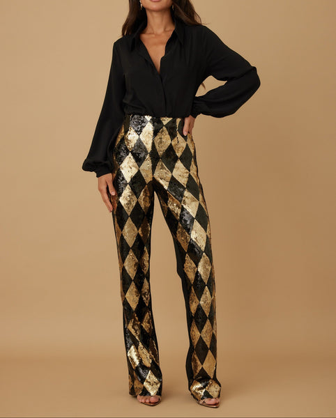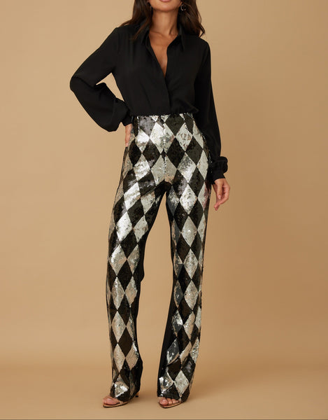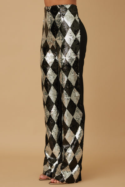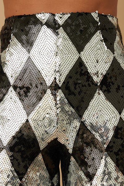 High style, silver sequined front high waist pants. Excellent fit, some stretch, zipper back.